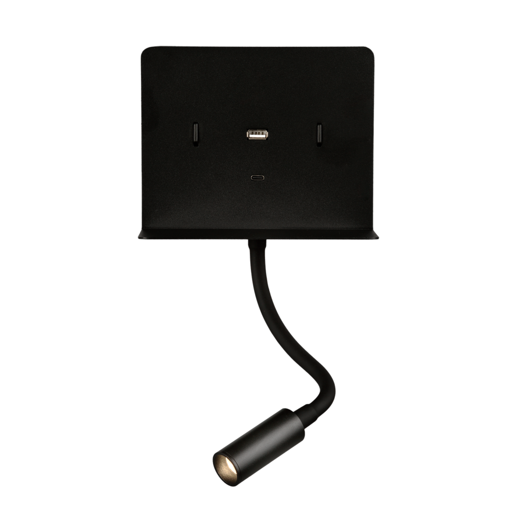 Materiali: Aluminium/Iron/PMMA Finitura: Textured Black Calma Wall Lamp 16/3836 Textured Black, LED 6W 3000K 630lm + 3W 3000K 285lm, CRI90 CL.I, Two switches, With USB, USB-C, Adjustable
