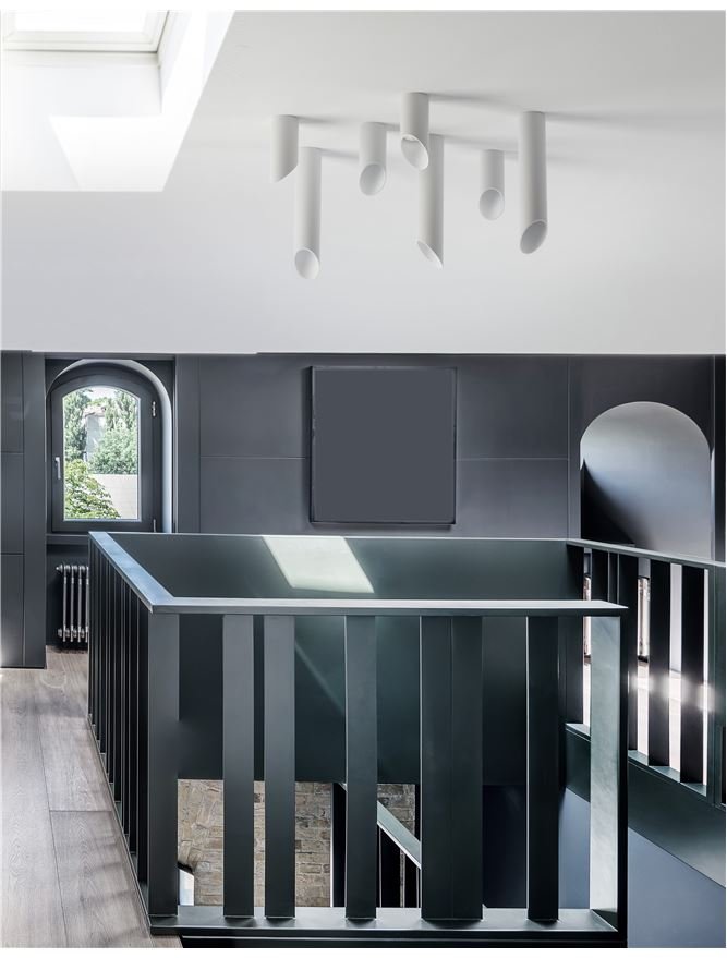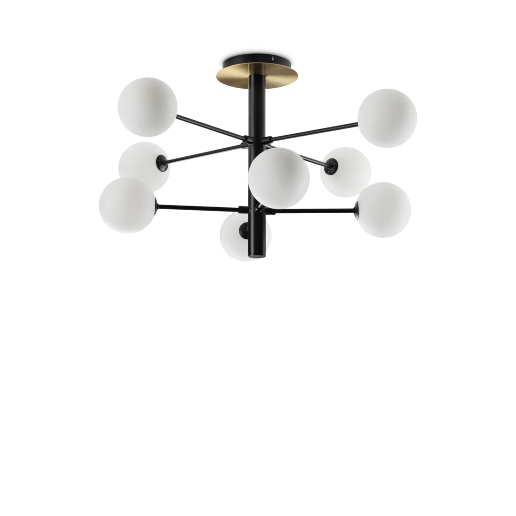 Atmosfera calda e sofisticata che valorizza ogni ambiente: una lampada da soffitto che diffonde luce avvolgente attraverso diffusori in vetro soffiato bianco acidato. Montatura in metallo con vernice opaca, finitura nero con dettagli in ottone satinato.