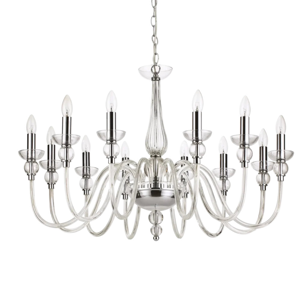 Lampadario in vetro, trasparente o bianco, soffiato e lavorato a mano. Montatura e dettagli in metallo rifinito in cromo.