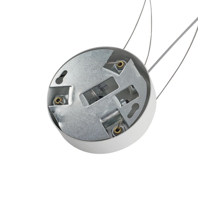 Rosone in metallo verniciato bianco opaco. Cavo in tessuto. Diffusore in vetro soffiato bianco acidato. Cesto in corda.