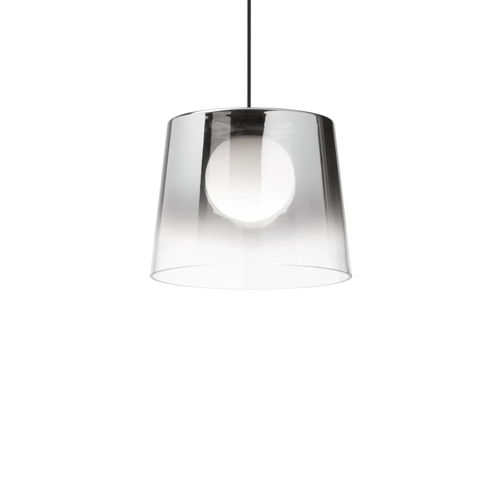 Luce elegante che valorizza ogni ambiente con raffinata semplicità. Lampada a sospensione con rosone e montatura in metallo, paralume in vetro con sfumatura galvanica cromo, diffusore interno in vetro bianco acidato e cavo in pvc nero. Ideale per interni contemporanei.