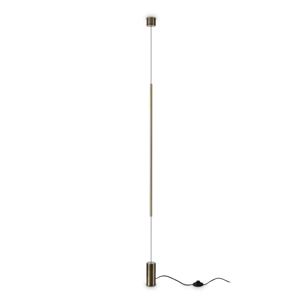 Rosone, corpo luce e base a terra in metallo verniciato a polveri o placcato. Diffusore in PC opale satinato. Cavo di sostegno in PVC nero. Alimentato dalla base a terra da cavo nero in PVC con spina. Finiture: bianco, nero oppure ottone.