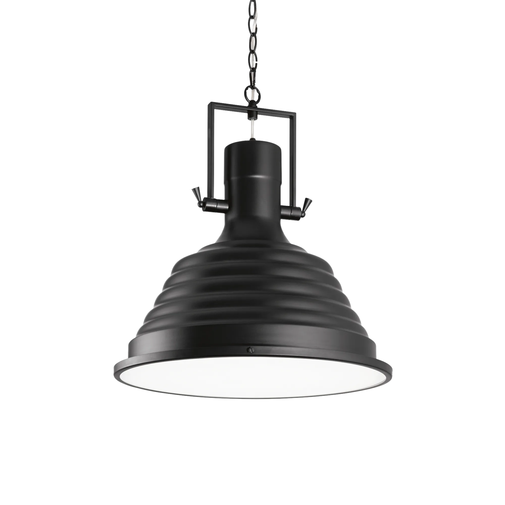 Corpo luce interamente in metallo con finitura in rame o in vernice nera opaca. Diffusore in lastra di vetro serigrafato bianco.