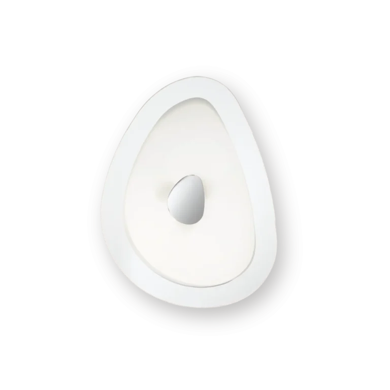 Montatura in metallo smaltato bianco. Diffusore con vetro trasparente serigrafato in bianco. Elemento centrale fissa vetro in metallo cromato.