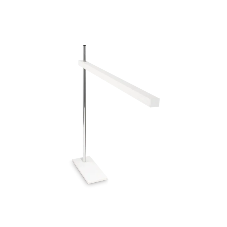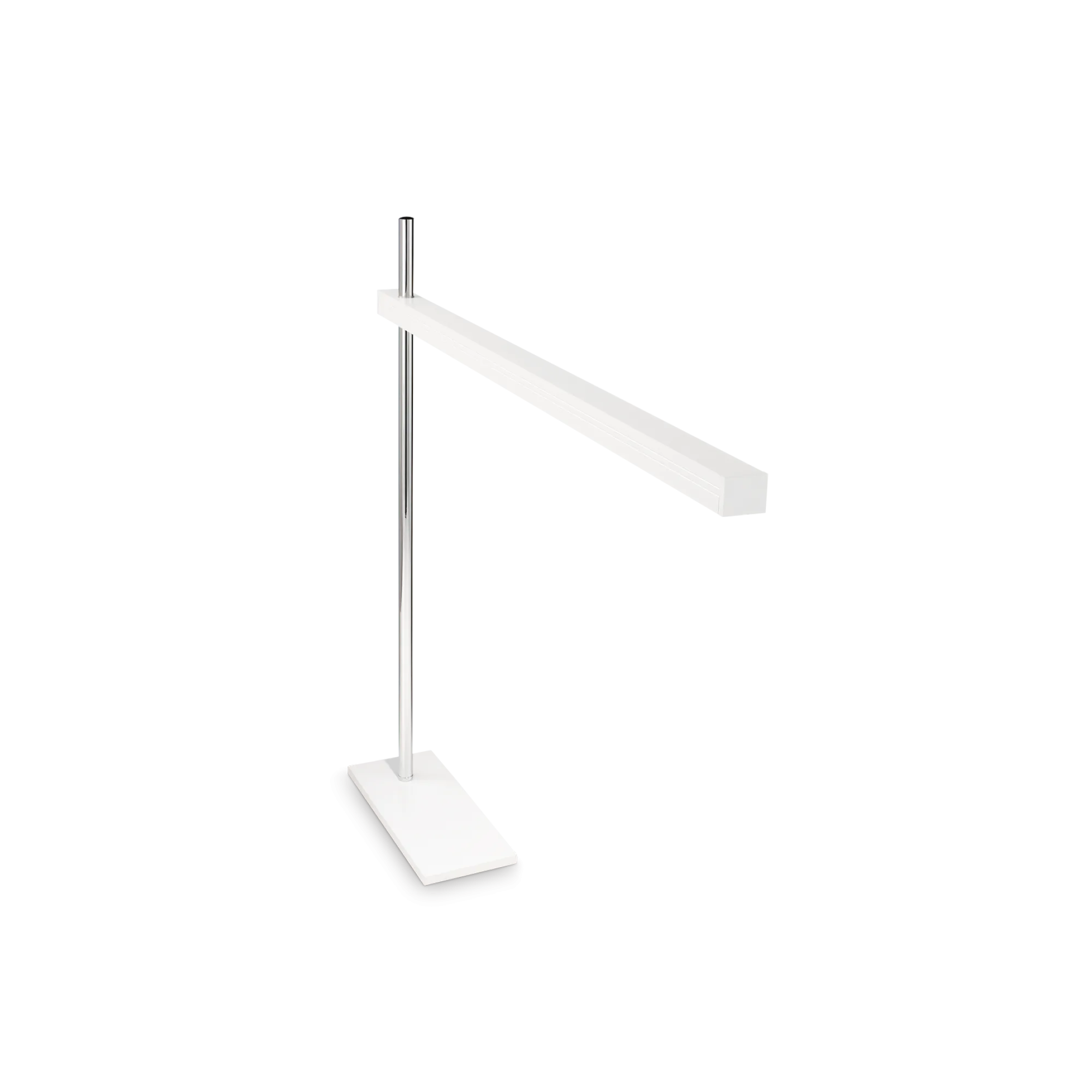 Montatura interamente in metallo. Asta con finitura in cromo. Base e diffusore con finitura in vernice opaca bianca o nera. Diffusore ruotabile e regolabile in altezza.