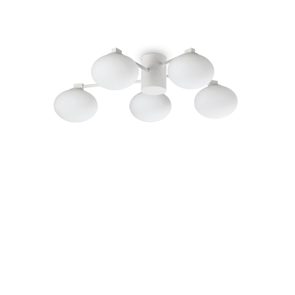 Base e montatura in metallo placcato. Diffusori in vetro incamiciato bianco, soffiato e acidato. Finiture: bianco oppure ottone satinato.