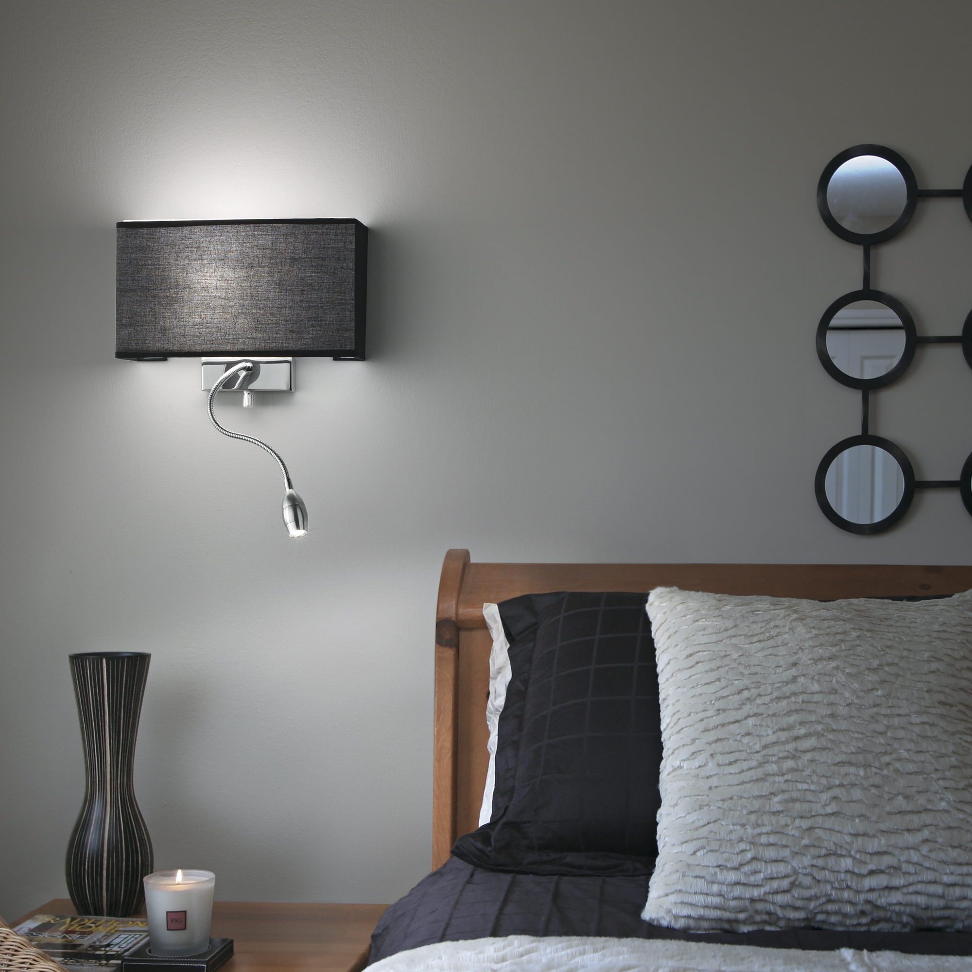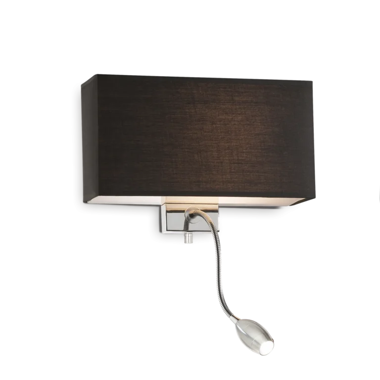 Atmosfera elegante che avvolge gli ambienti in una luce calda e controllata. Paralume rivestito in tessuto nero e diffusori in vetro satinato. LED esterno orientabile con interruttore indipendente per dirigere la luce, perfetta per ogni stanza.