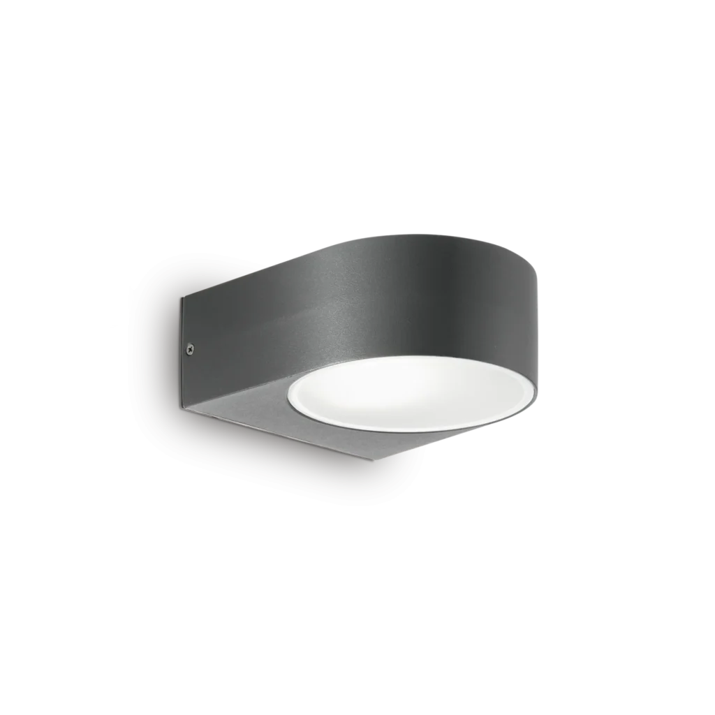 Corpo luce in alluminio pressofuso verniciato a polveri. Doppio diffusore, superiore e inferiore, in vetro temperato trasparente e sabbiato. Disponibile nelle finiture antracite, bianco o grigio.