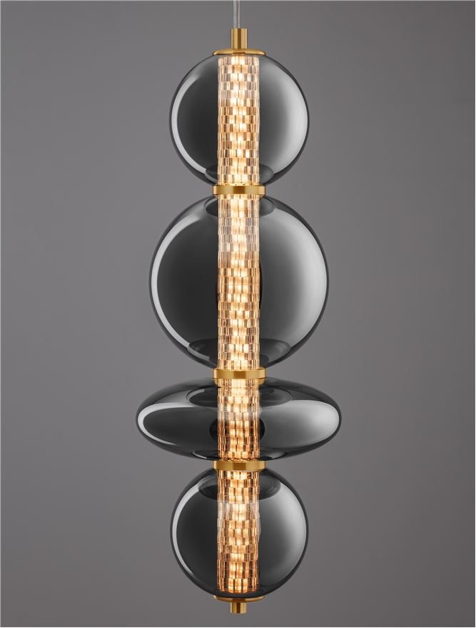 Crea un’atmosfera sofisticata e avvolgente che valorizza ogni ambiente. Vetro grigio fumé che regala un aspetto raffinato e un effetto visivo discreto, perfetto come lampada a sospensione per salotti e dining contemporanei.