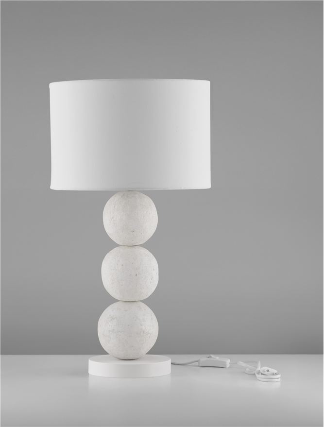 Un’atmosfera avvolgente e raffinata che trasforma ogni angolo in un rifugio di comfort e stile. Realizzata in papier mâché White Stone con paralume in tessuto, regala una luce morbida e diffusa che valorizza la decorazione.