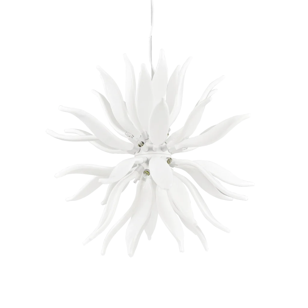 Montatura in metallo bianco. Elementi decorativi in vetro soffiato bianco e modellato a mano. Cavi d’acciaio regolabili in lunghezza.
