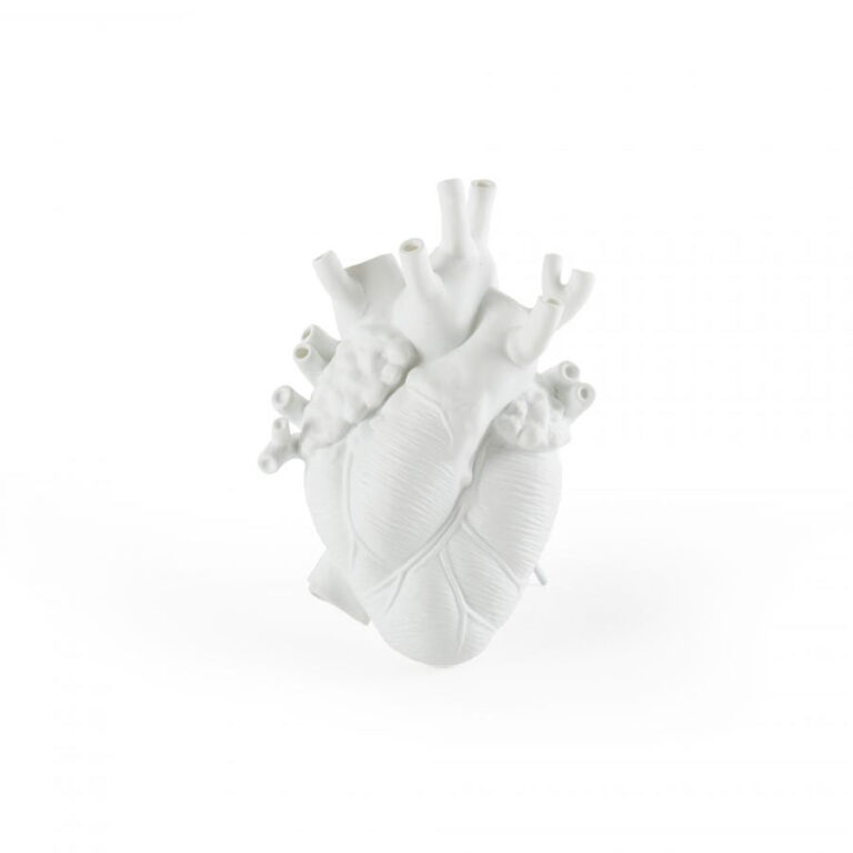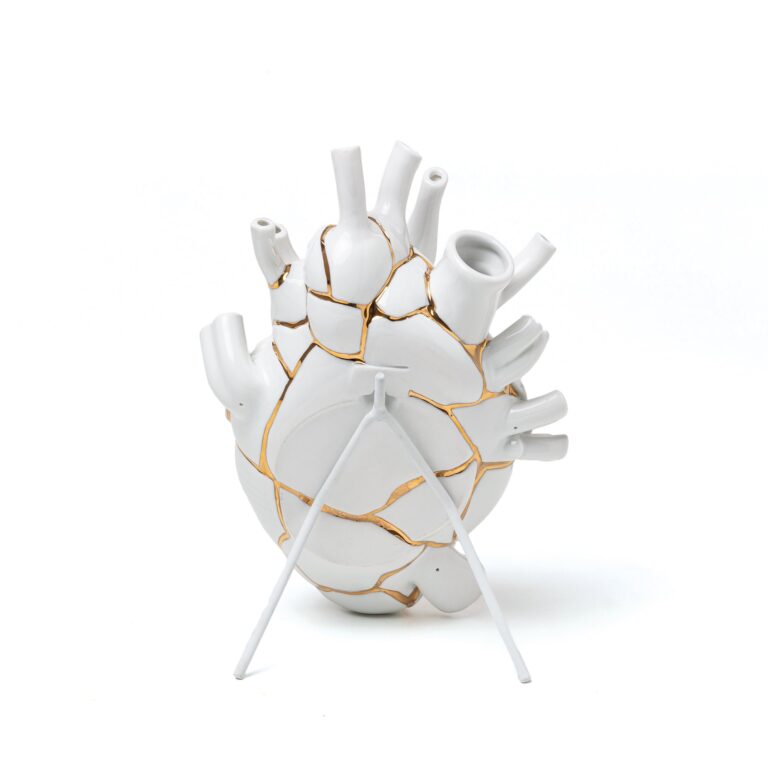 Mettiamo i fiori nel cuore attraverso le vene, come se il cuore fosse il bulbo da cui sbocciano i boccioli dei sentimenti. Questo cuore ha vissuto e ora, con i pezzi uniti dall’oro, ci racconta la sua storia con forte identità ed estetica. Vaso