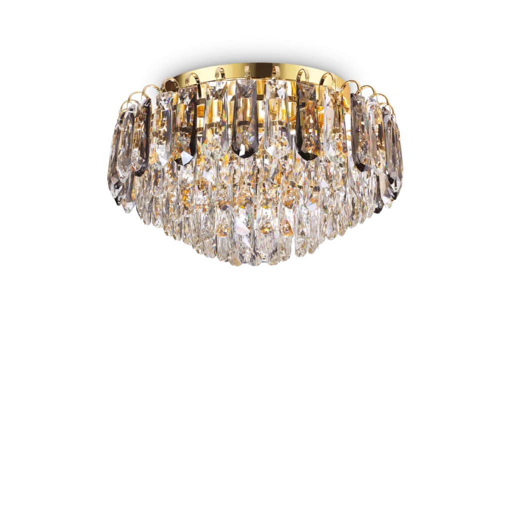 Atmosfera calda e raffinata che valorizza ogni ambiente. Lampada da soffitto in color magnolia con montatura in metallo finitura oro, elementi decorativi in cristallo molato trasparente e parte superiore con alternanza di pezzi trasparenti e fumé.