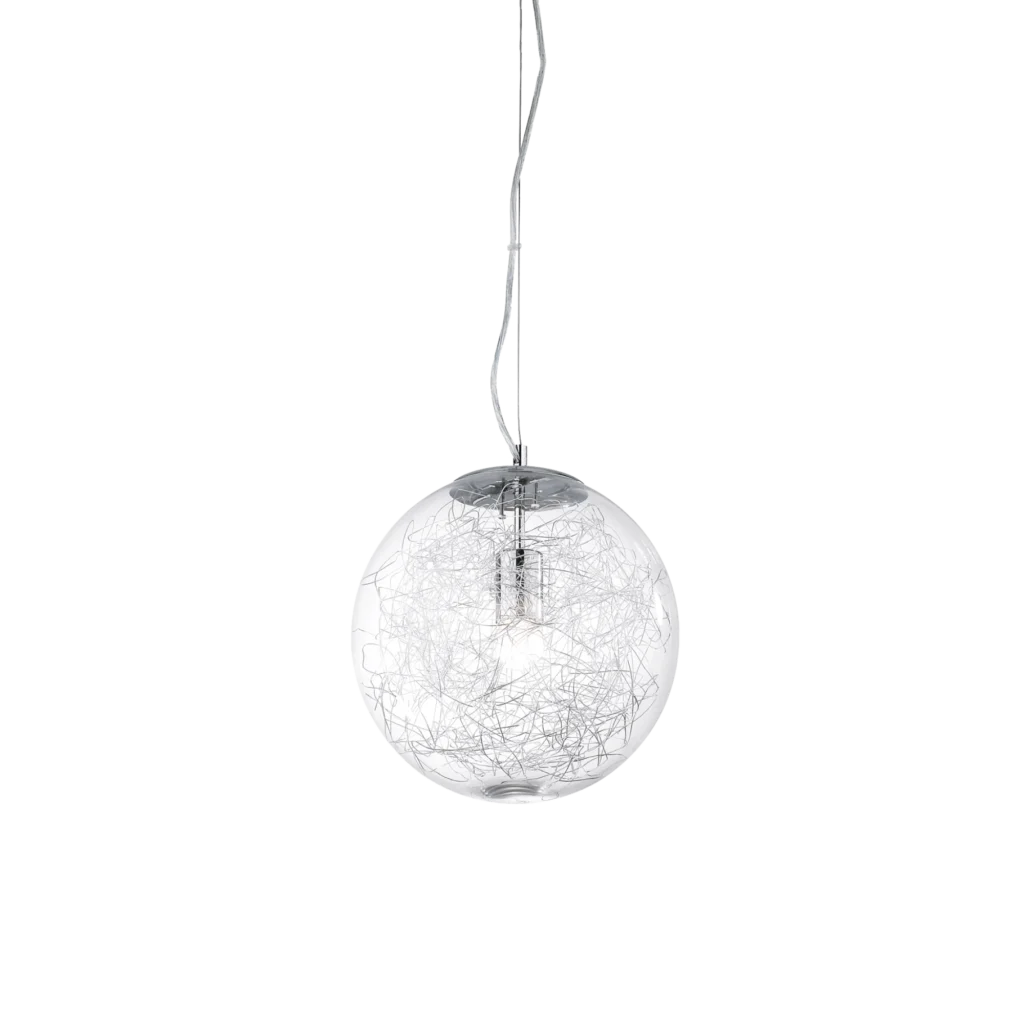 Una lampada a sospensione che dona un’atmosfera calda e raffinata. Montatura in cromo, diffusore in vetro soffiato con decorazione interna in filo d’alluminio e sospensioni con cavo in acciaio regolabili tramite ferma cavo automatico.