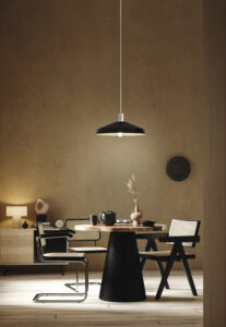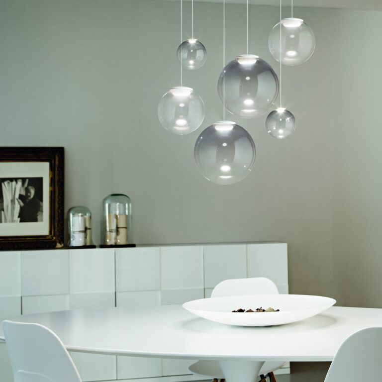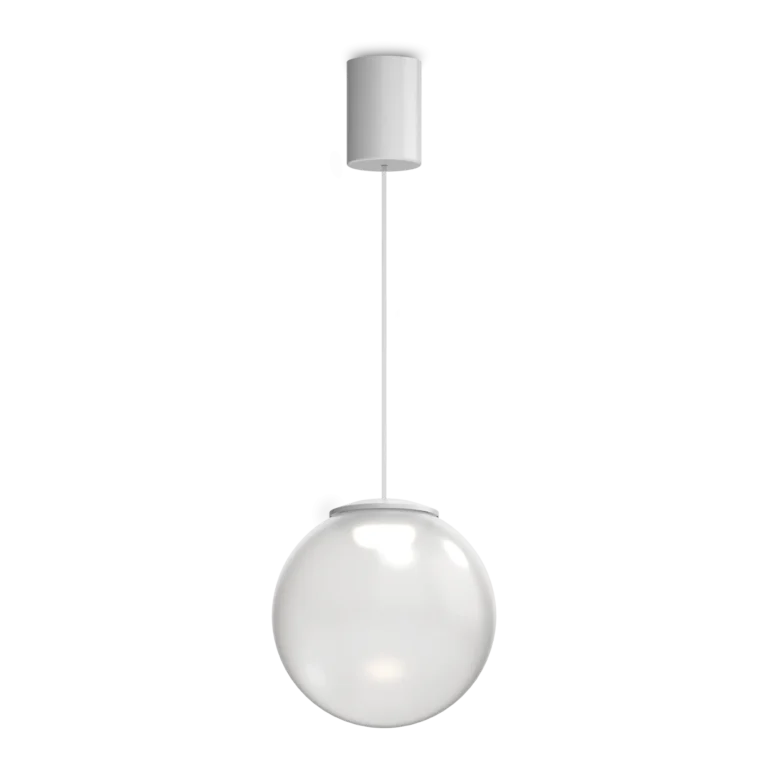 Una luce sobria e raffinata che valorizza l’ambiente creando un’atmosfera calda e accogliente. Rosone in metallo verniciato opaco bianco, cavo in pvc trasparente, elemento reggi vetro in silicone trasparente opaco e diffusore in vetro soffiato.