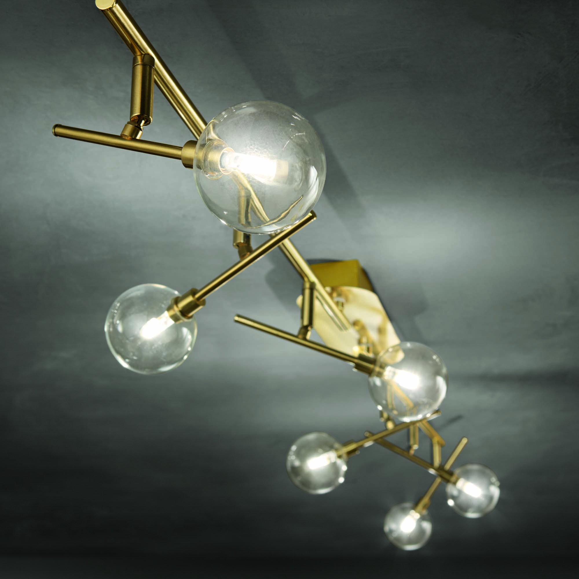 Montatura interamente in metallo rifinito in ottone satinato. Diffusori orientabili in vetro soffiato trasparente.