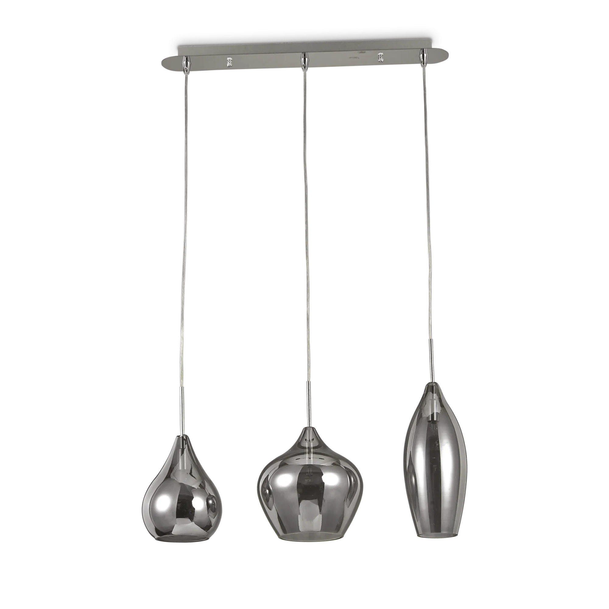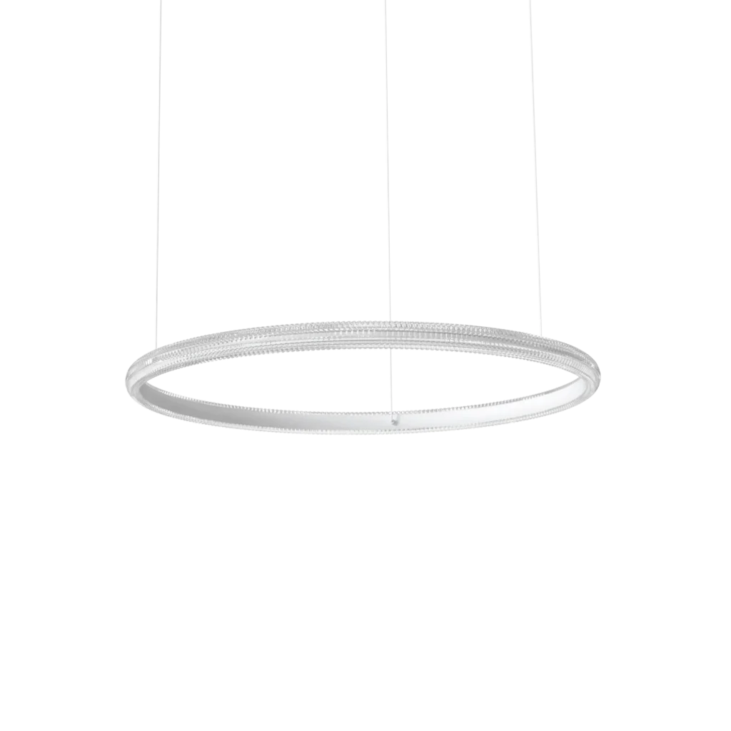 Rosone, montatura e supporti a soffitto in metallo verniciato a polveri opaco. Cavi di sostegno in acciaio. Cavo elettrico in pvc. Diffusore con elementi acrilici trasparenti decorati in rilievo con effetto cristallo. Colore: bianco.