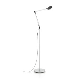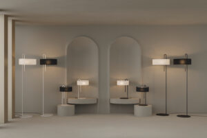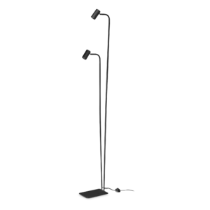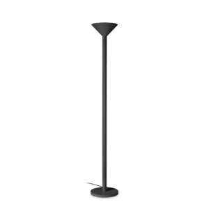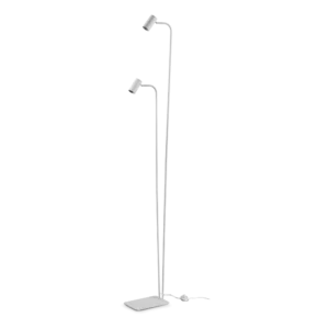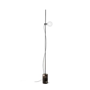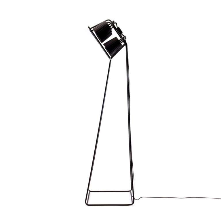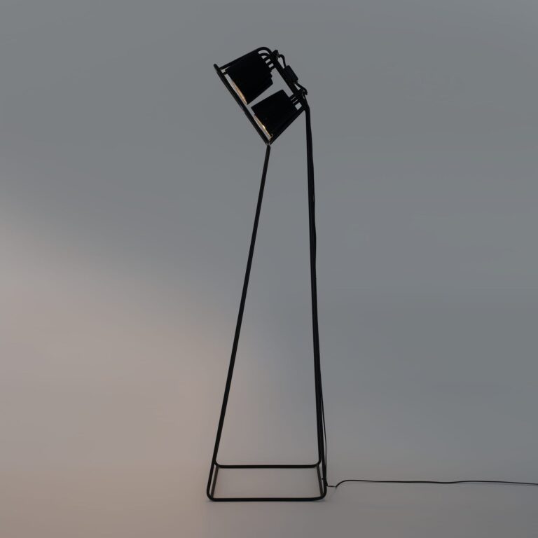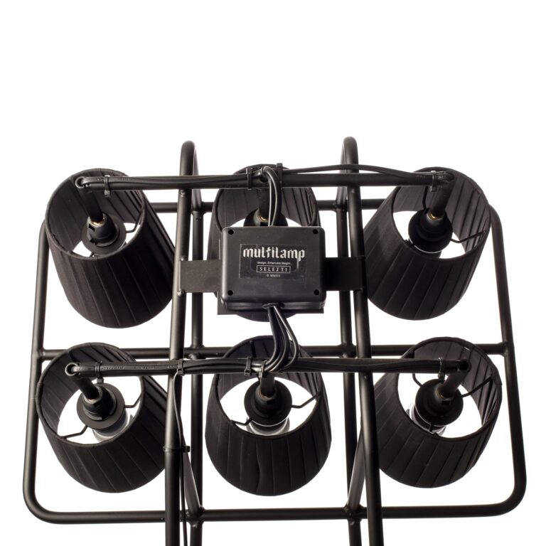 Una linea di illuminazione dal design industriale. Come in un set cinematografico, un mix di combinazioni eclettiche in versione bianca o nera. Lampada da terra con 6 paralumi