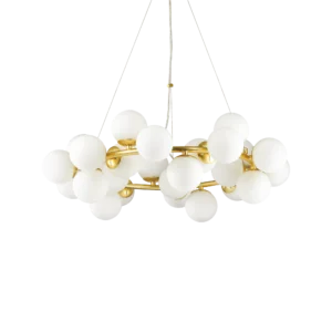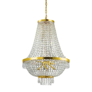Montatura in metallo con finitura oro. Elementi decorativi in cristallo trasparente molato. Quadrati nella parte superiore e a losanga in quella inferiore. Copricatena in velluto.
