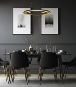 Montatura in metallo cromato o dorato. Elementi decorativi in vetro soffiato e cristallo molato. Copricatena in velluto.