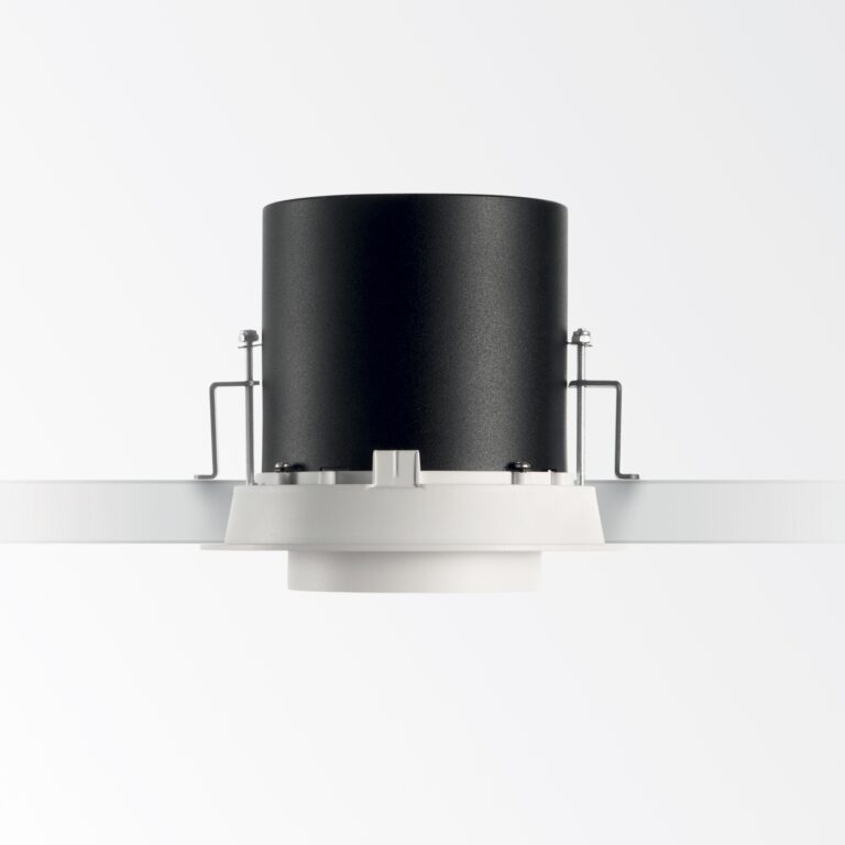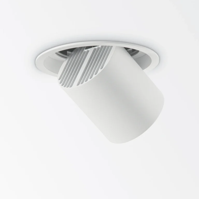 Faretto a incasso in alluminio pressofuso con ghiera rotonda, adatto per installazione su soffitti in cartongesso o a pannelli. Finitura bianca opaca o nera opaca. Sorgente orientabile a 360° ed estraibile fino a 90° rispetto all’asse verticale.