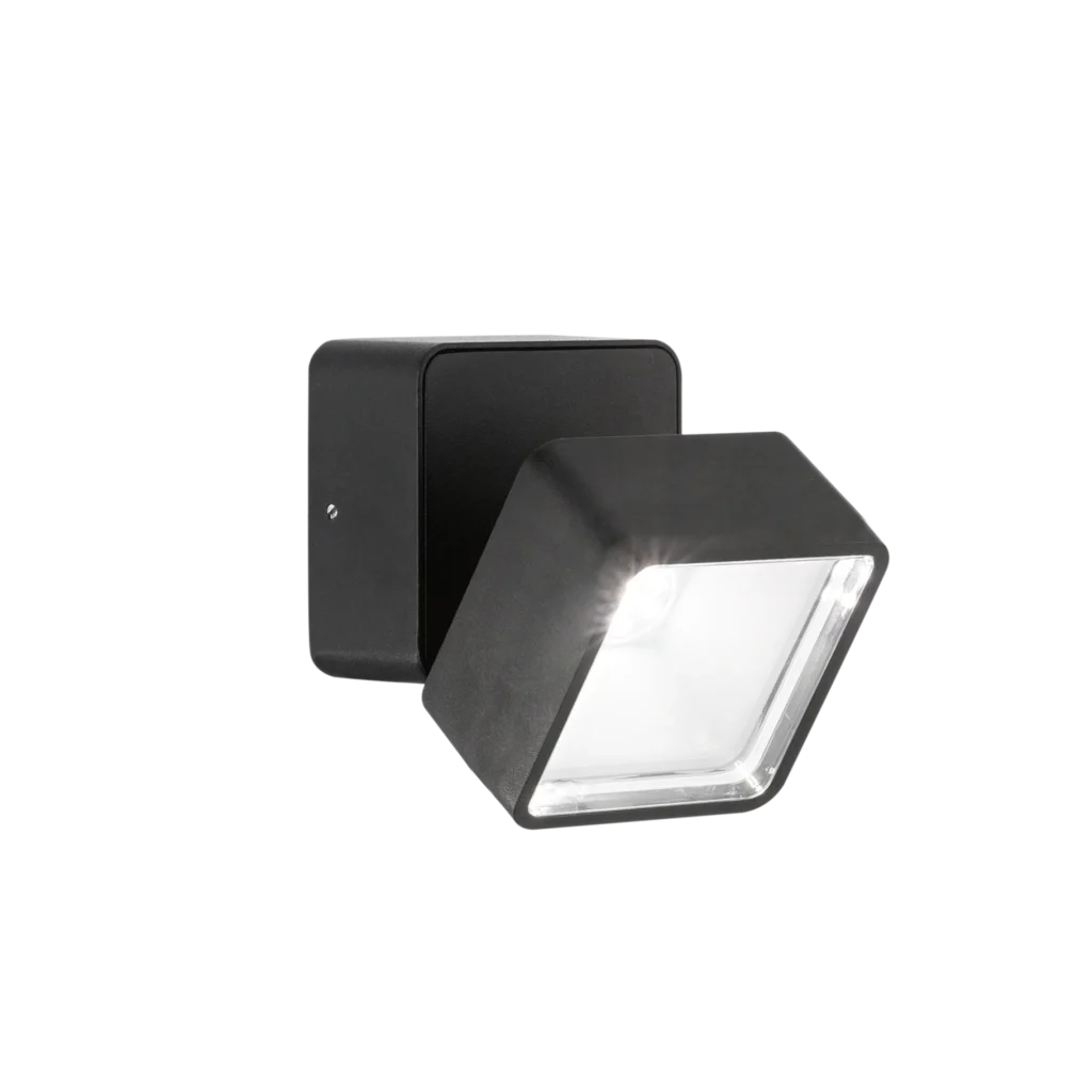 Corpo luce in alluminio verniciato a polveri. Diffusore inclinabile con schermo in vetro. Disponibile nelle finiture antracite, bianco o nero.