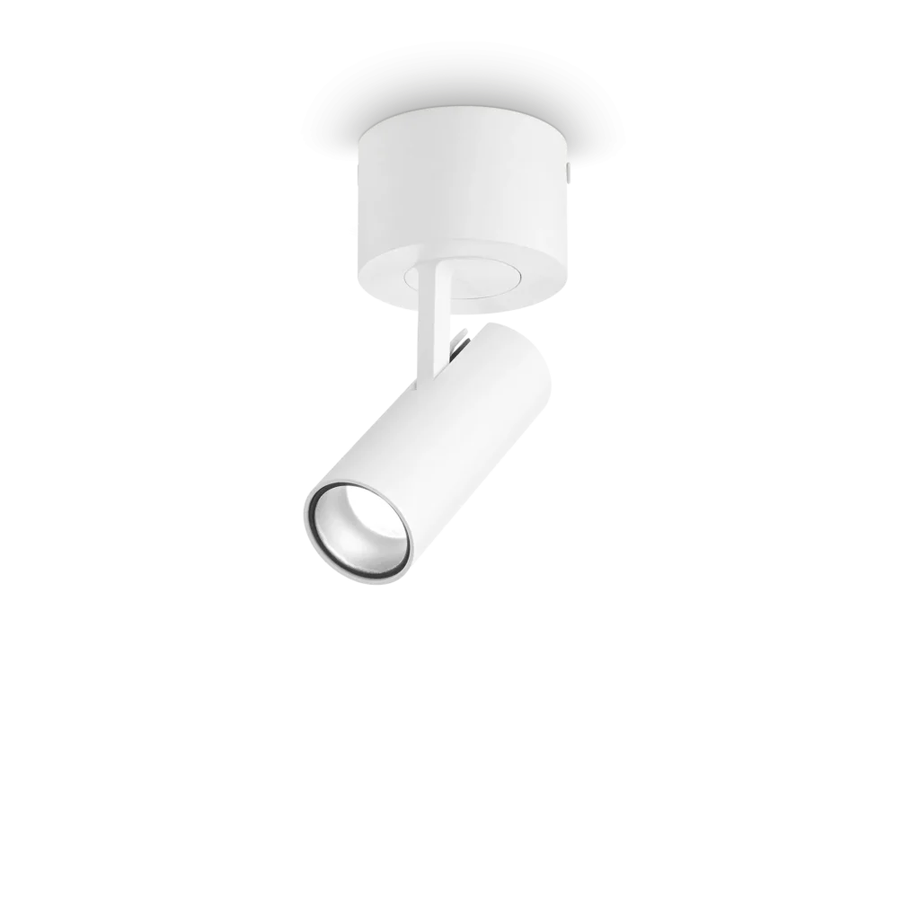 Base, snodo e corpo luce orientabile in alluminio pressofuso verniciato a polveri. Diffusore in acrilico trasparente zigrinato. Disponibile nelle finiture nero oppure bianco con cover posteriore e ghiera frontale interna neri.