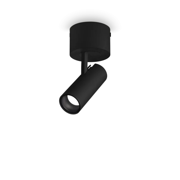 Un fascio di luce elegante che crea atmosfere intime e raffinate, ideale per valorizzare ogni stanza. Base snodo e corpo orientabile in alluminio pressofuso verniciato a polveri, diffusore in acrilico trasparente zigrinato finitura nero.