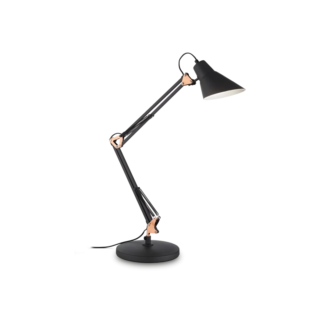 Lampada tecnica in metallo con finitura bianco, nero opaco oppure nero con snodi in rame. Braccio snodato e bilanciato a molle. Diffusore orientabile.