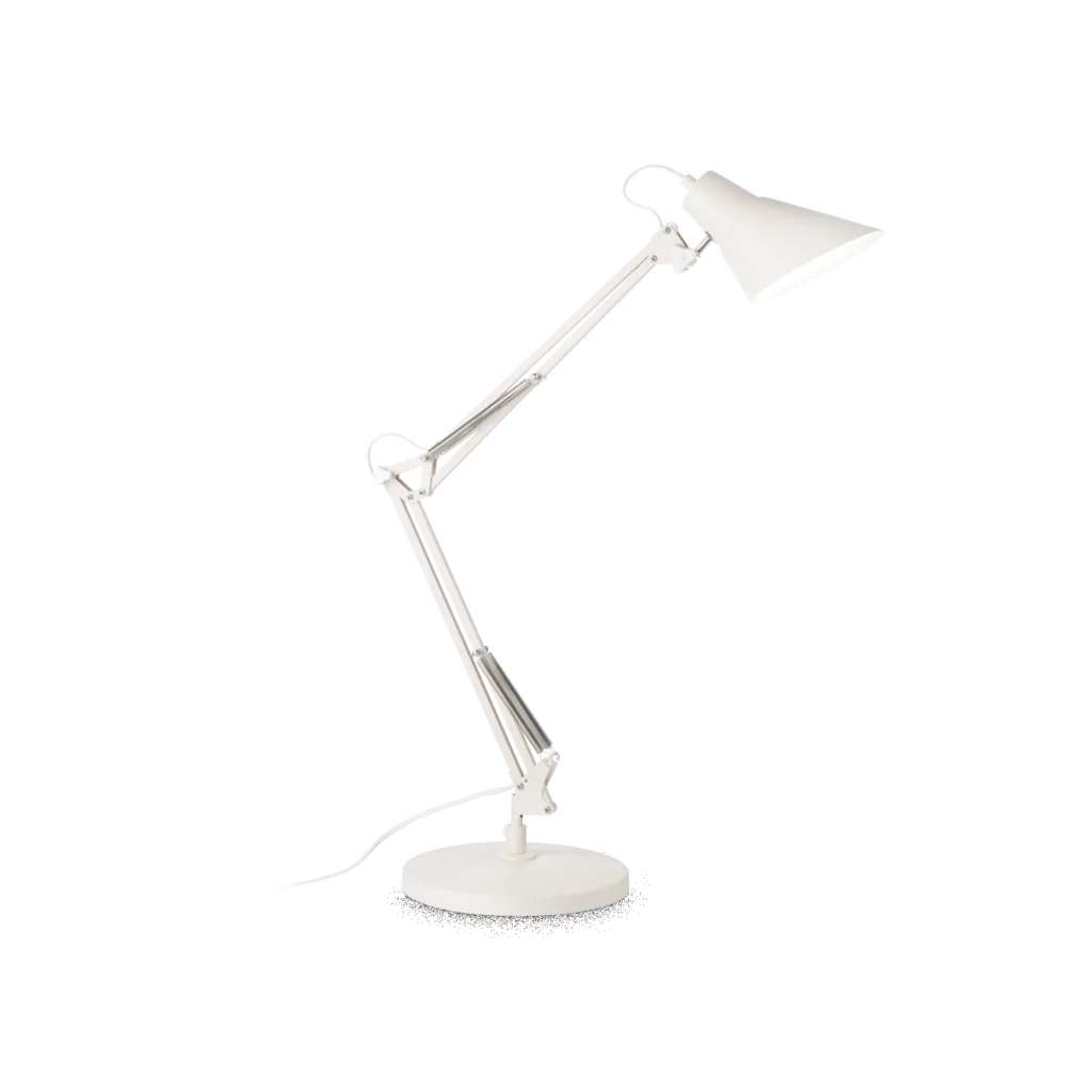 Eleganza discreta e funzionale per illuminare con precisione il tuo ambiente di lavoro o lettura. Lampada in metallo con finitura bianca, braccio snodato e bilanciato a molle e diffusore orientabile per direzionare la luce dove serve.