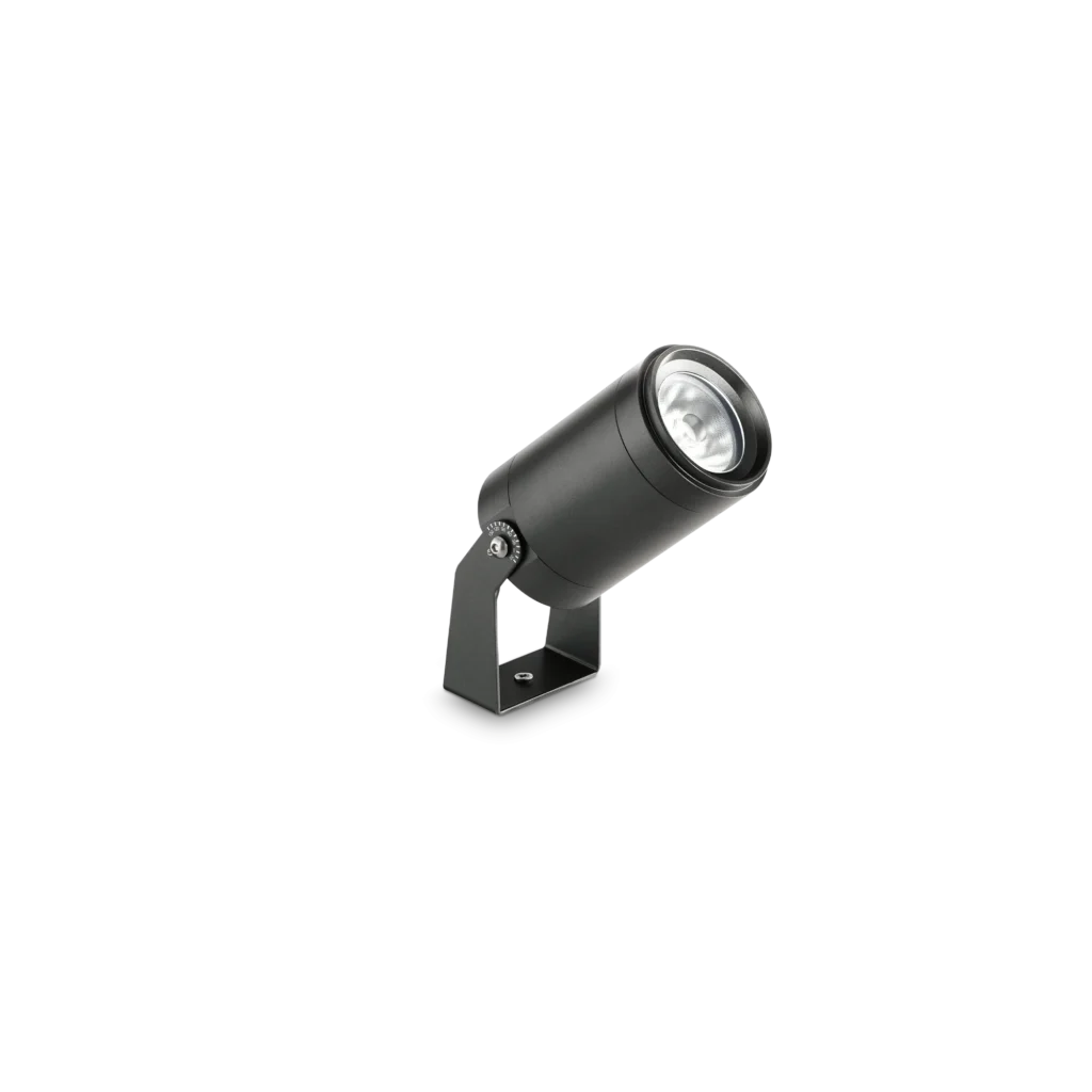 Proiettore orientabile in alluminio con fissaggio a plafone o con picchetto, superficie anodizzata e verniciata a polveri in grigio scuro, LED integrato ad efficienza energetica con elevata resa cromatica. Visiera antiabbagliamento in opzione.