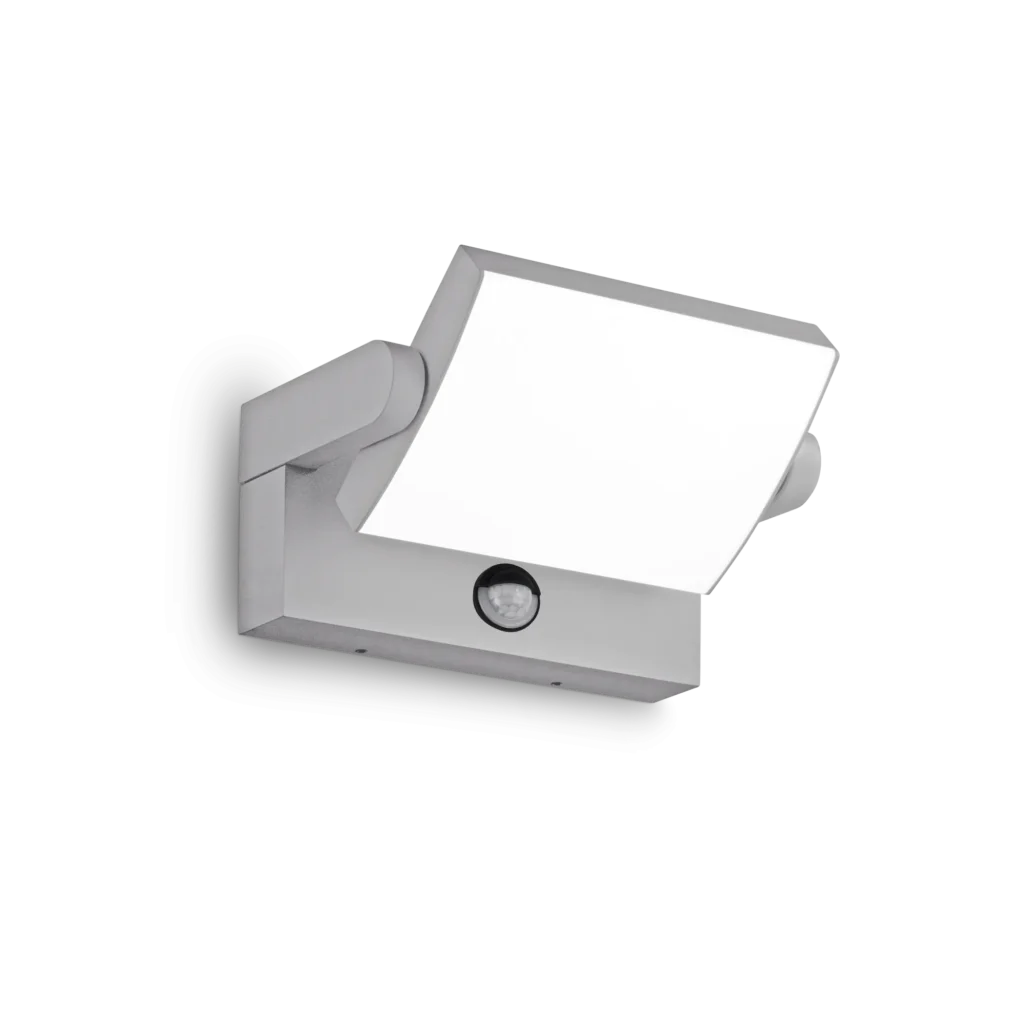 Atmosfera accogliente e moderna per esterni, ideale per valorizzare ingressi con luce uniforme e discreta. Corpo in alluminio verniciato, diffusore orientabile in policarbonato opale lucido, dotata di sensore crepuscolare e movimento, finitura grigio.