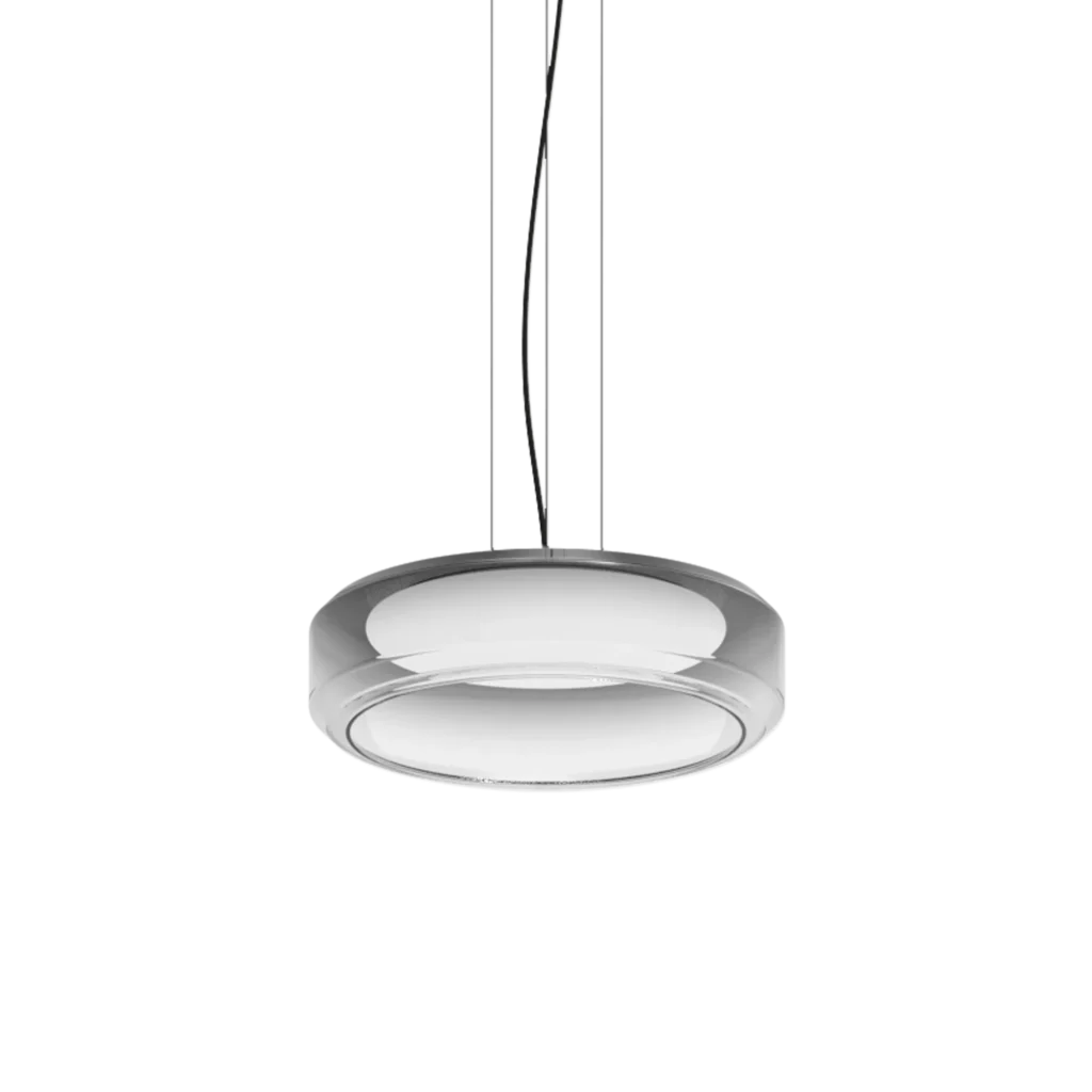 Rosone e montatura in metallo verniciato opaco. Diffusore con doppio vetro: interno bianco acidato, esterno trasparente con sfumatura fume’ sulla parte superiore. Cavo in pvc nero. Colore: nero.