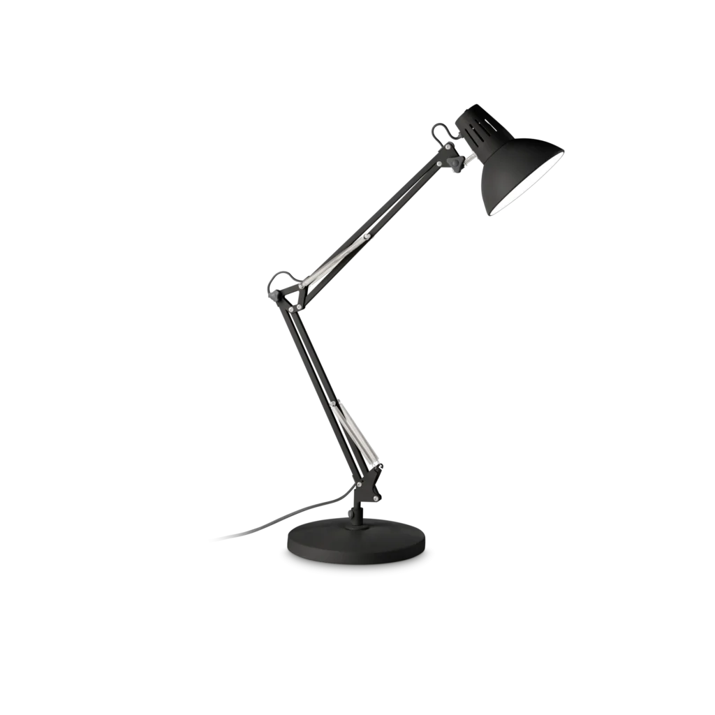 Lampada tecnica in metallo con finitura bianco, nero opaco oppure nero con snodi in rame. Braccio snodato e bilanciato a molle. Diffusore orientabile.